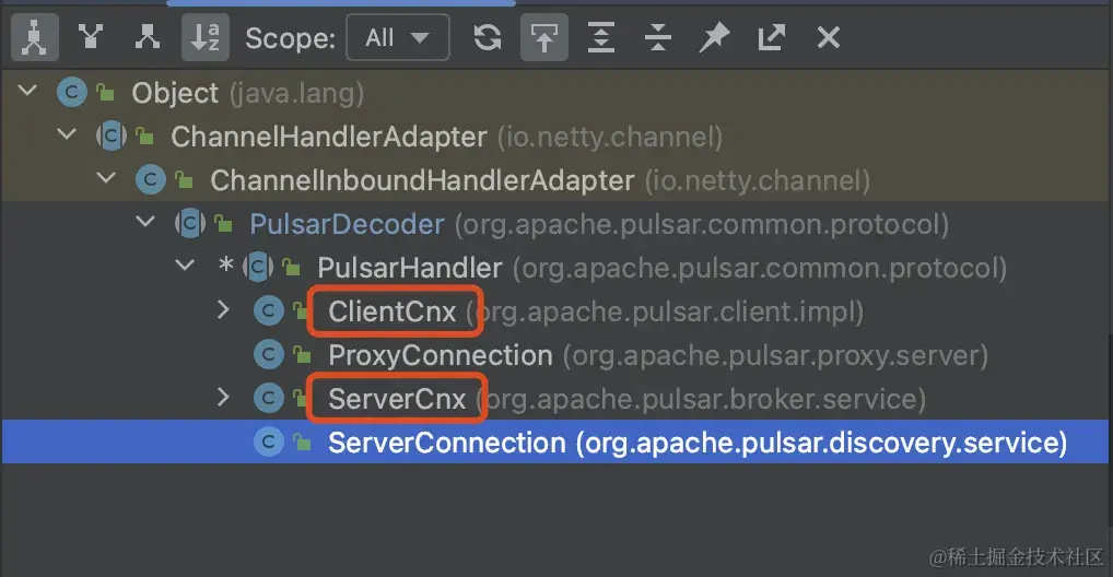 PulsarClient 使用 Netty 作为网络通信框架, 是标准的 Netty 客户端。协议处理和事件驱动都是依托于 Netty。核心处理类直接继承于 Netty Handler。
