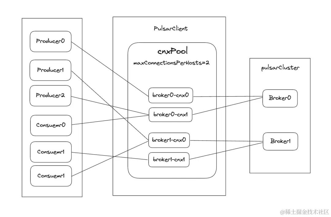 得益于连接共享,客户端消耗的连接数是很少的,PulsarClient 会为每台 Broker 创建一个连接池,默认连接数为1, 用户可以使用 ConnectionsPerBroker 配置来设置每台 Broker 最大连接数。ProducerImpl、ConsumerImpl 在初始化时,会随机从连接池中获取一个连接用来和服务端通信。