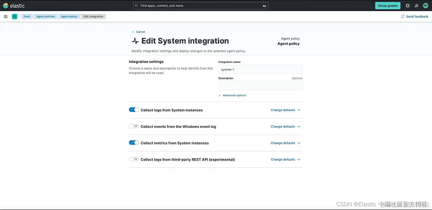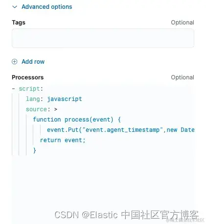 展开收集指标 (Collect metrics) 部分并打开 System process metrics -> Advance Options。 添加脚本处理器,它将为所有事件添加代理时间戳。