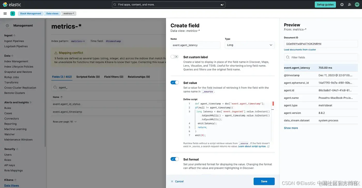 创建一个新的运行时字段 event.agent_latency 并使用以下脚本设置延迟值。