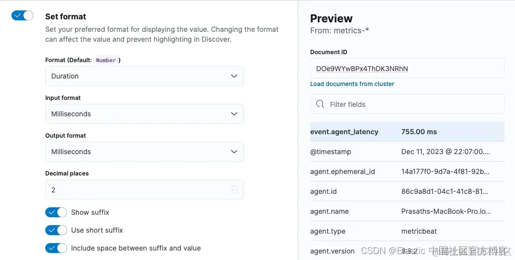通过提供包含以下内容的文档 ID 来预览延迟值 event.agent_timestamp 字段。