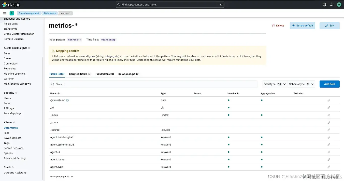 现在我们可以使用运行时字段来计算延迟。 在 Kibana 中,转到 “Data Views” 部分,然后单击 “metrics-*” Data view。