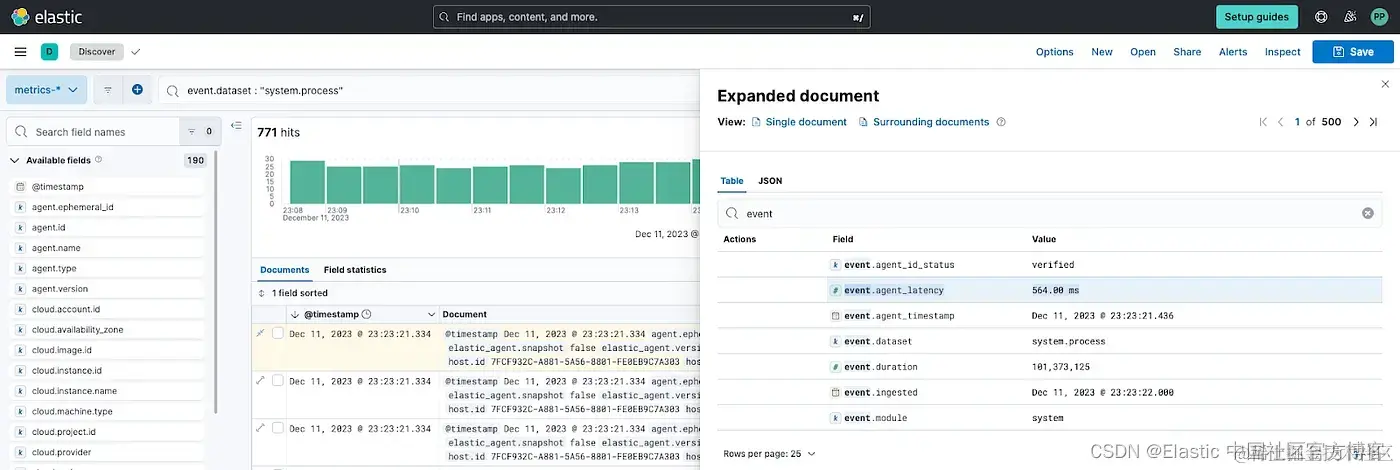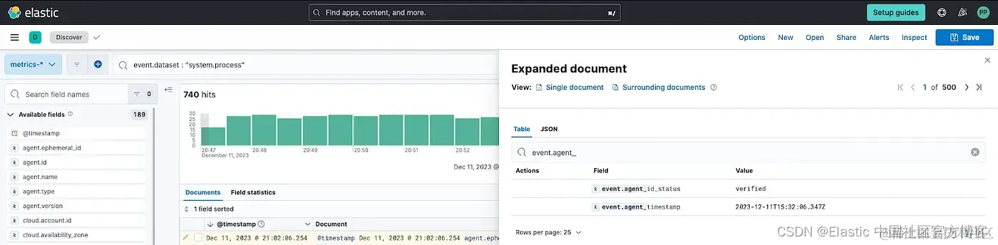 就是这样,我们已经将 event.agent_timestamp 字段添加到所有 System process metrics 事件中,我们可以在 Discover 中看到这一点。