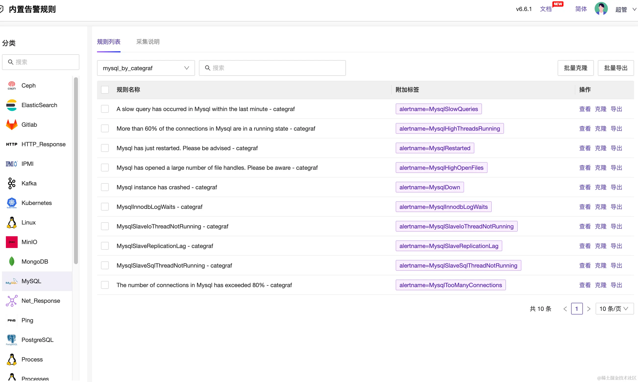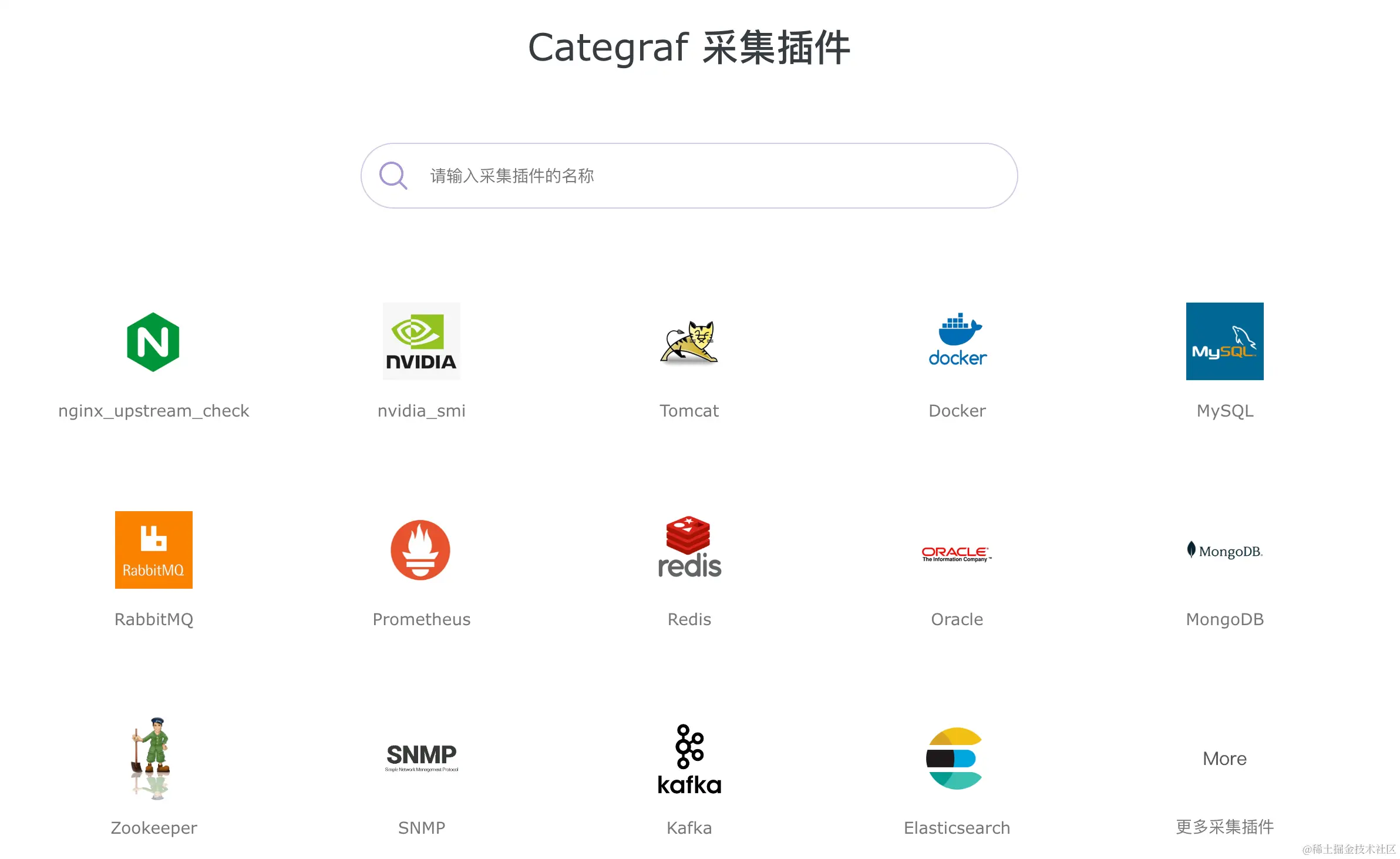 大一统的监控数据采集,夜莺的采集端为Categraf,覆盖支持上百种采集对象,比如K8s、中间件、服务器、交换机等,只需要配置下地址即可采集