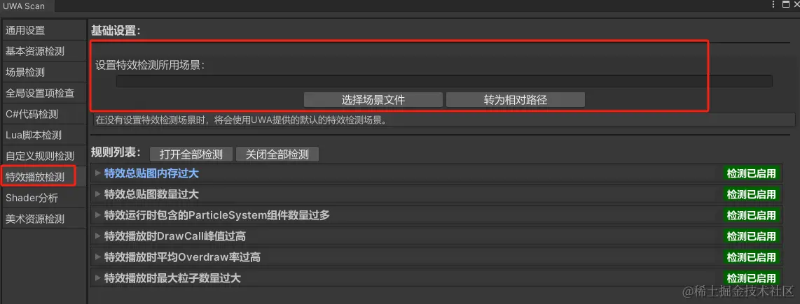 需要注意的是,所选的场景中一定要确保存在Tag为MainCamera且处于Active状态的相机,否则在进行特效检测时将使用UWA提供的默认的特效检测场景。