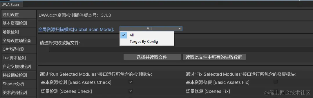 在本次3.1.3版本中,针对本地资源检测的资源扫描模式,UWA对原有的模式和功能进行了重新设计。在本地资源检测的“通用设置-全局资源扫描模式”的选项设置面板中提供“All”和“Target By Config”两种模式选择。