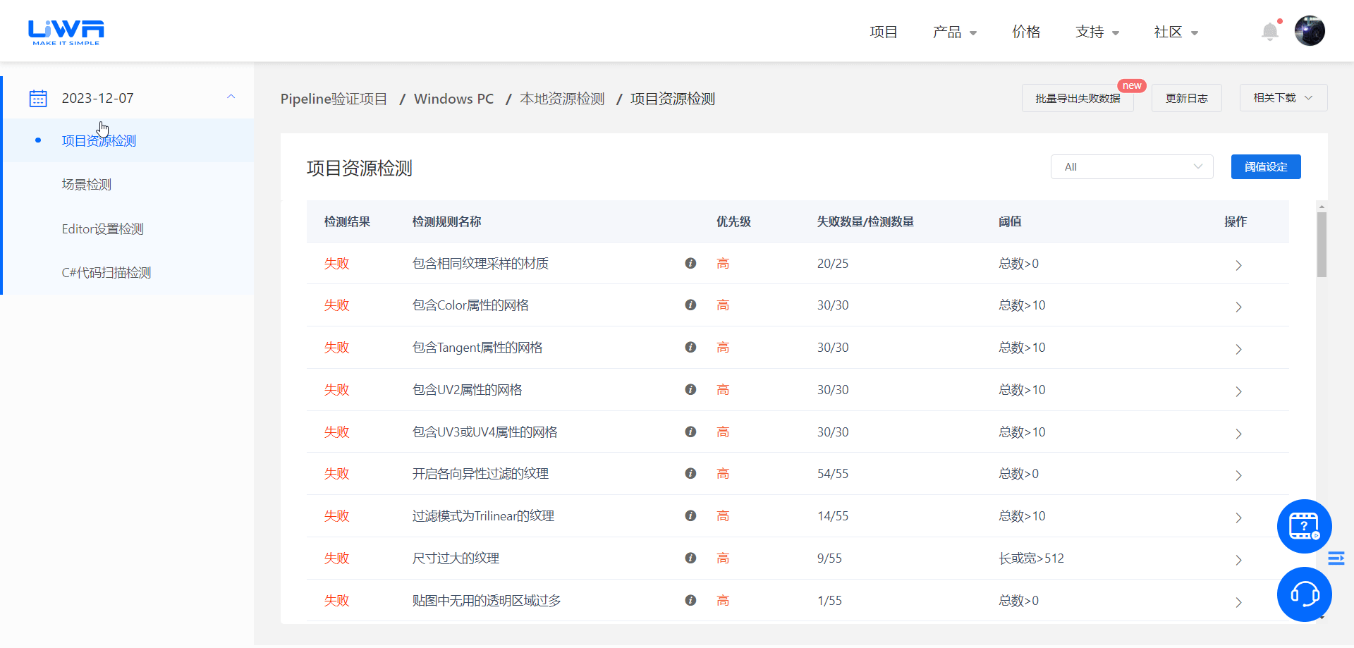 本地资源检测报告中,项目成员可以在网页端快捷高效地查看各条检测规则下,不符合阈值设定和检测要求的各项问题资源和相应信息,并可以将失败资源的信息导出成表格文件,与项目组自己的资源统计报表等进行更全面直观的对比。同时,也可以选择导出当前检测规则的全部检测数据,获取项目工程中所有符合当前规则检测内容和检测范围的被检测资源信息。