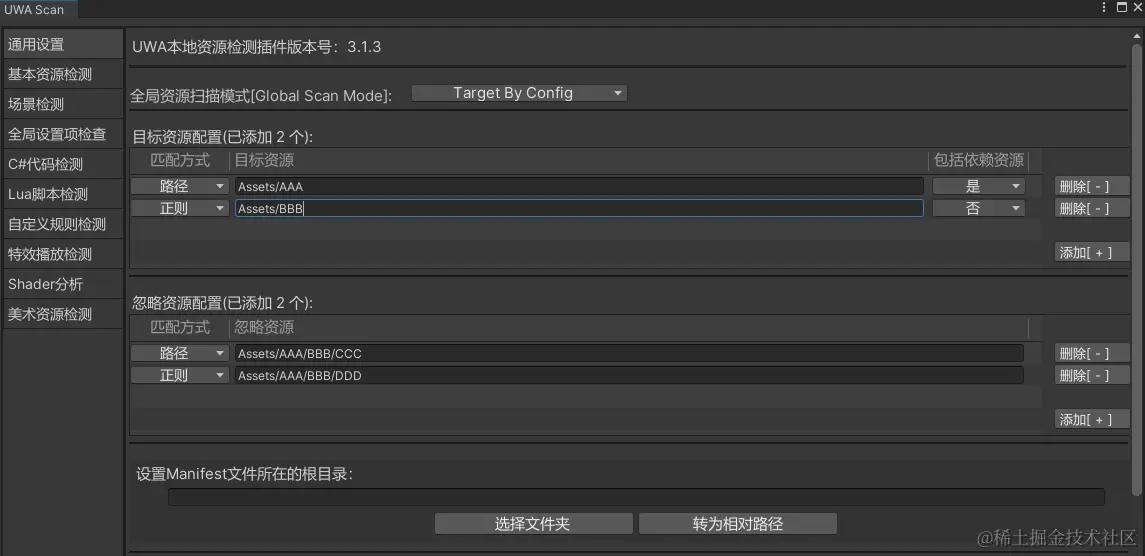 本次更新中,本地资源检测新增了Manifest文件扫描配置:在“通用设置-全局资源扫描模式”中,选择“Target By Config”后,项目组可以添加相应Manifest文件所在的文件夹路径。然后进行扫描检测时,本地资源检测就能根据相关Manifest文件中记录的资源信息,对这些资源进行扫描检测。