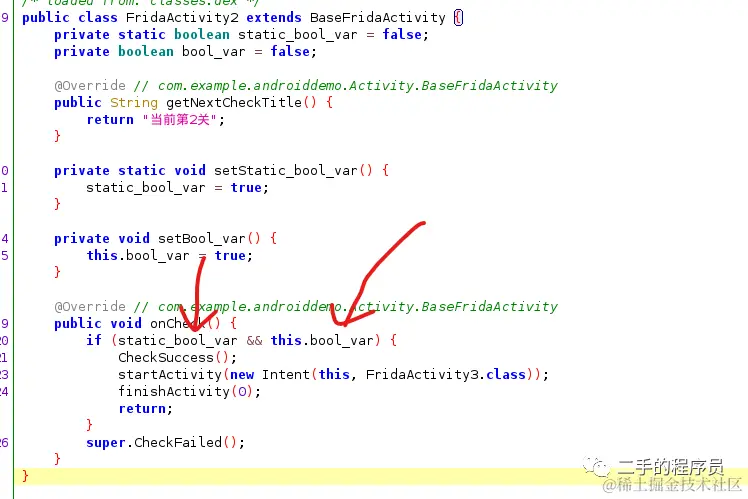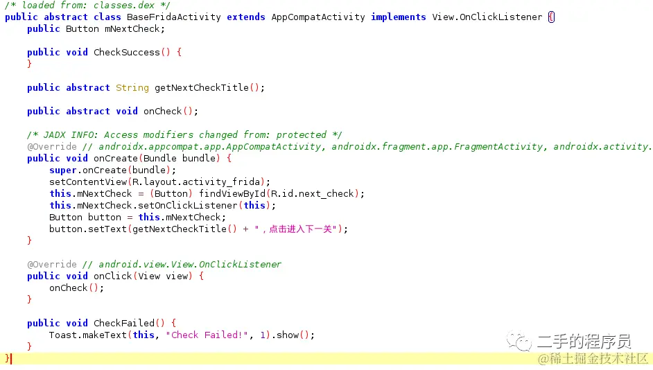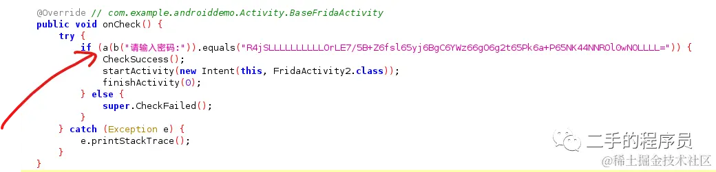 核心逻辑在 FridaActivity1 的 onCheck 方法里面,我们得让 a(b("请输入密码:")) 这个玩意的结果返回后面那一长串字符即可。