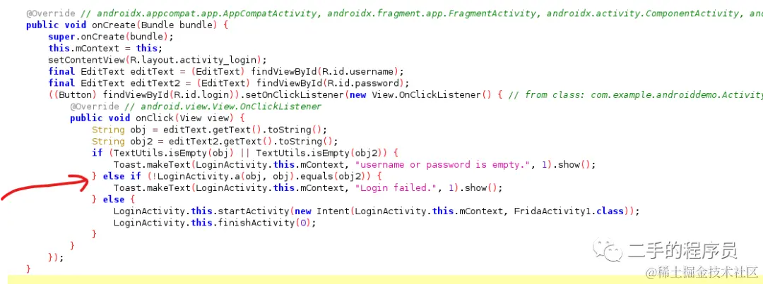 LoginActivity.a 方法返回了一个字符串,obj2 是第二个输入框的字符串。