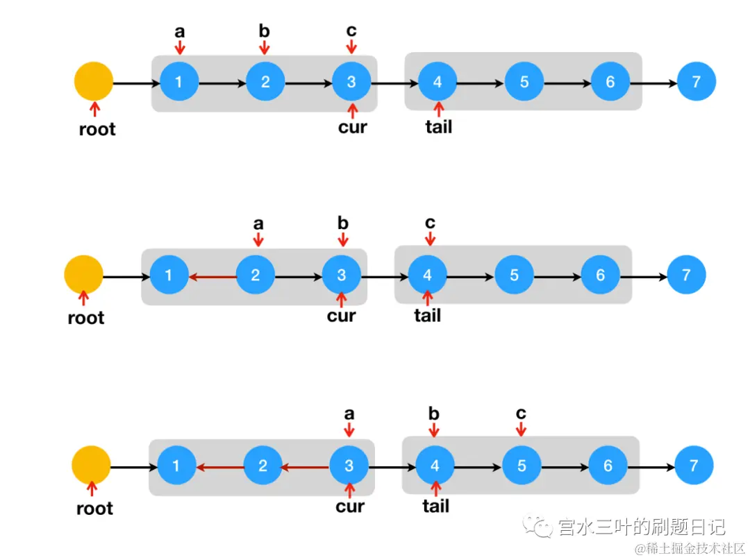 当以 root 为起点的长度为 的一段翻转完成后,再将下一个起始节点传入,直到整条链表都被处理完成。