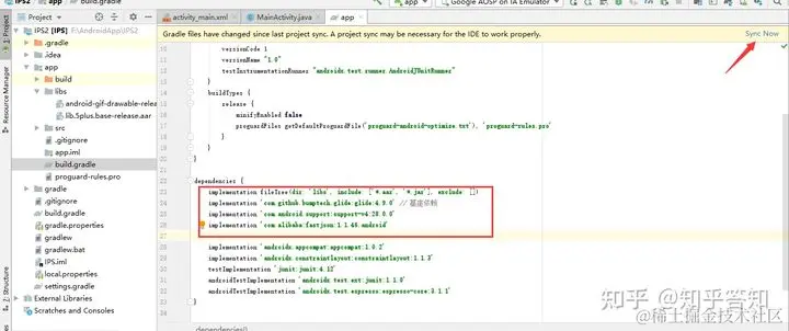 - 编辑 app/build.gradle,引入lib文件 implementation fileTree(dir: 'libs', include: ['.aar', '.jar'], exclude: []) implementation 'com.github.bumptech.glide:glide:4.9.0' // 基座依赖 implementation 'com.android.support:support-v4:28.0.0' implementation 'com.alibaba:fastjson:1.1.46.android' 添加代码如下图所示,第一行 exclude可改可不改