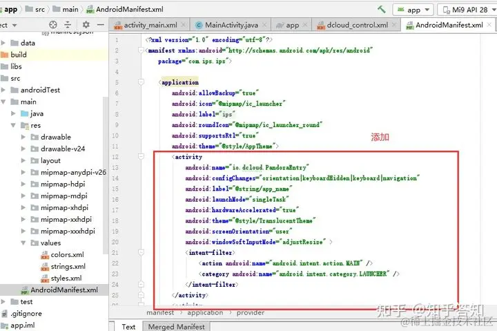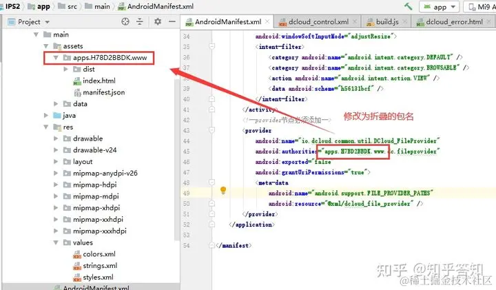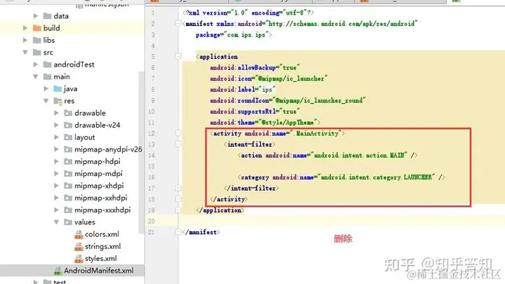 我这里对比一致无需更改,如果不一样的话,以manfest.json中的appid为准 在 app/src/main 下编辑 AndroidManifest.xml 删除 MainActivity 代码片段