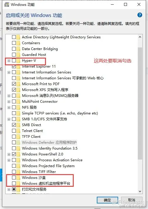 - 在启用或关闭windows功能里,取消勾选红框这两项目