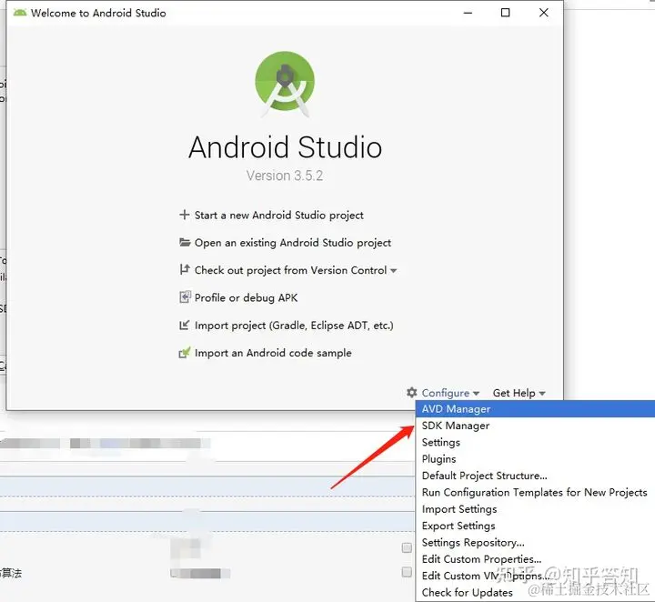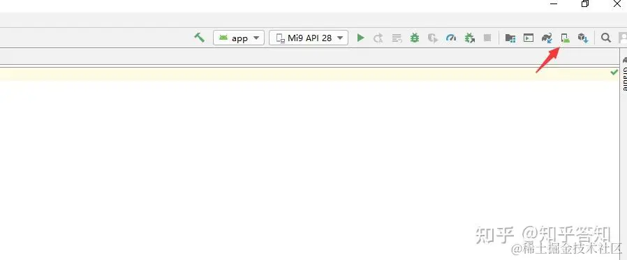 7.安装AVD 点击顶部工具栏右侧手机图标,如下图,创建AVD虚拟手机,也就是手机模拟器
