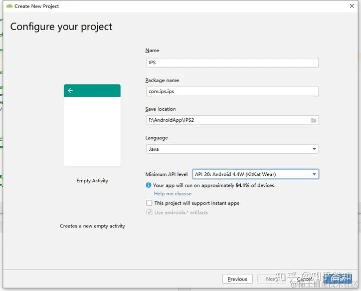 Minimum API level最小支持的API我选的是20,下面说明94%的手机都支持这个API,