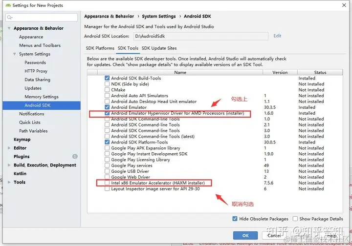 - 使用 AMD替代的加速器,取消 HAXM ,点击下图工具栏这个管理包