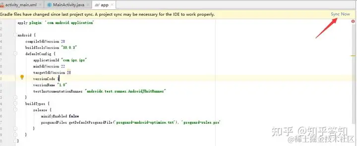 接着 app/build.gradle 顶部, 将 compileSdkVersion 和 targetSdkVersion 值改成28, 将 minSdkVersion 改成 22 applicationId为创建时的包名,compileSdkVersion为编译版本, minSdkVersion为兼容最小的版本号,targetSdkVersion为目标版本, 有兴趣的可以百度一下三者之间的区别和联系。注意, 官方文档中标注“App离线SDK minSdkVersion最低支持19,小于19在部分4.4以下机型上将无法正常使用。” versionCode需要设定一个数值,一般为1, 每次更新版本时versionCode的值都要比前一个设置的值大, 否则无法正常安装,versionName一般填写主版本号次版本号和修正号, 如图中的“1.0”为最初版本号,其余的可以自行查阅。 修改后点击右上角 sync now 进行同步