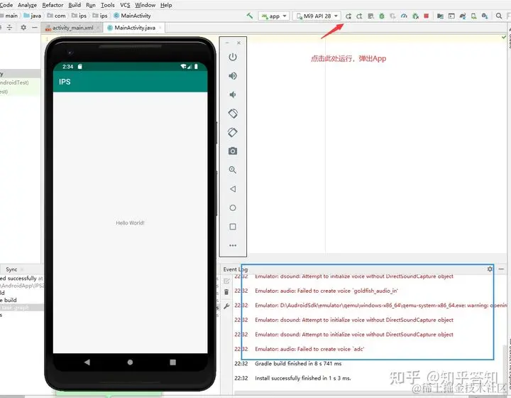 最后点击Finish完成,然后点击下图得位置,可以尝试运行一下刚创建的空项目app 点击工具栏手机运行按钮,顺利的话会弹出 Hello world 的App如下所示
