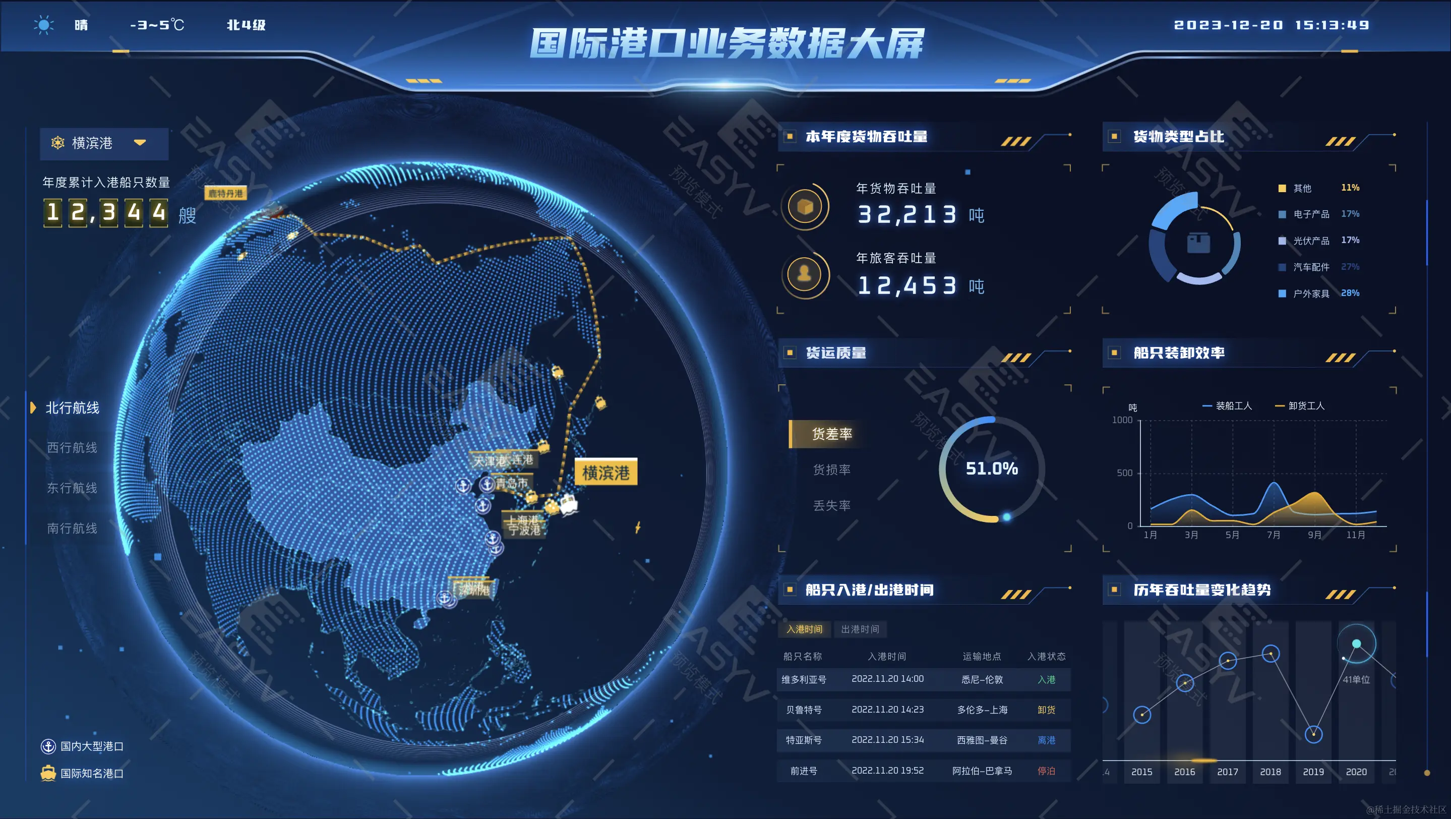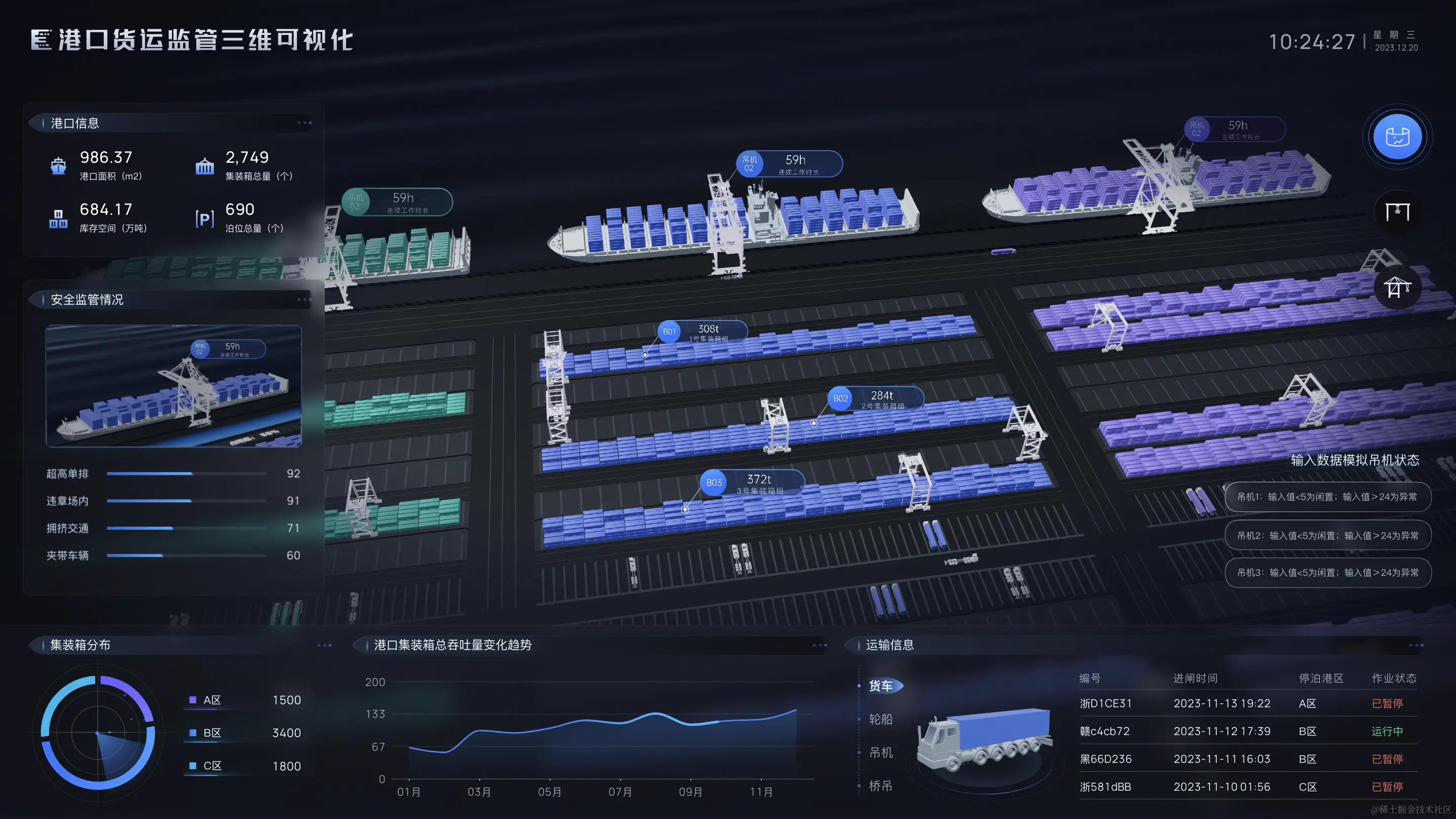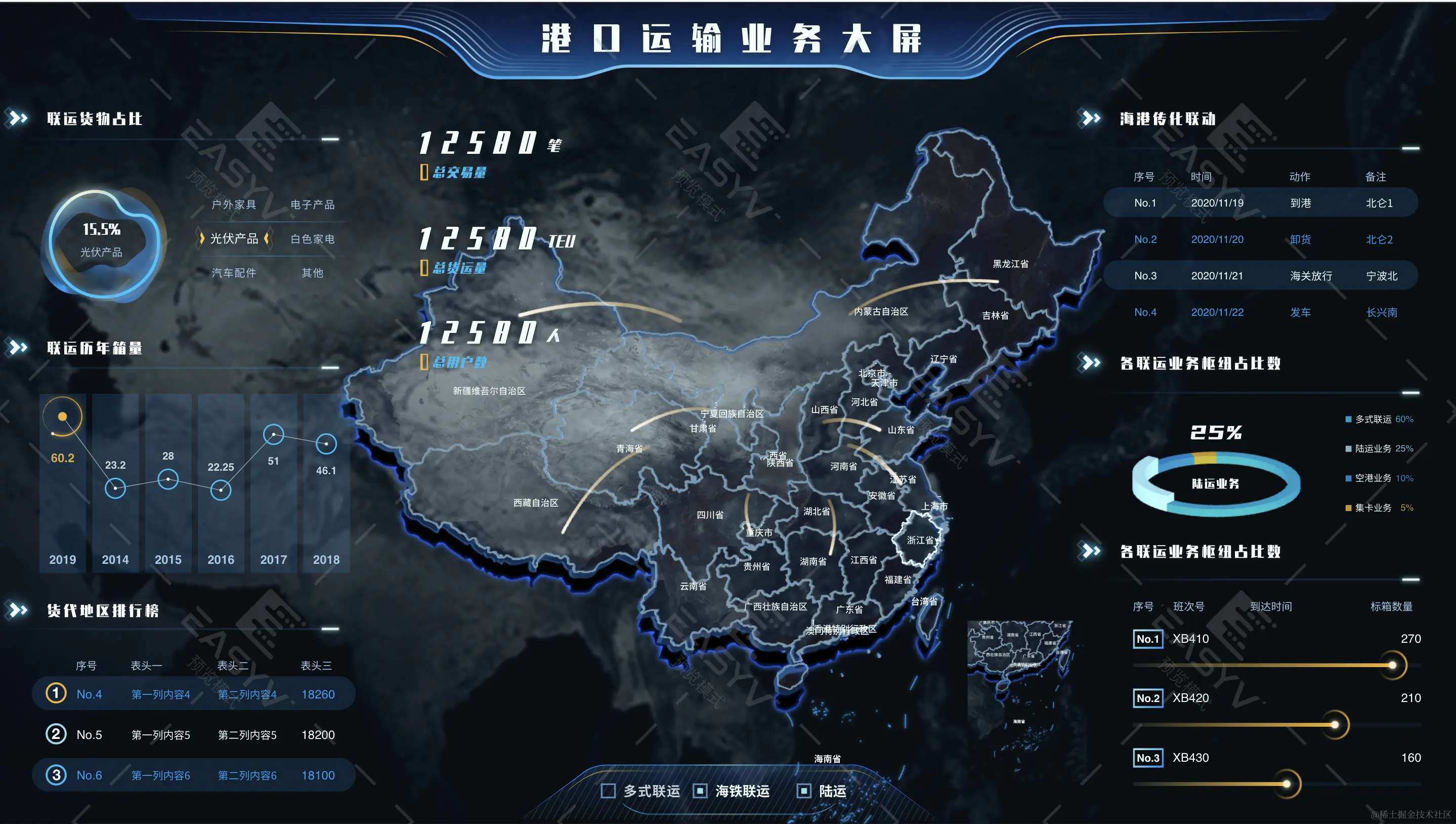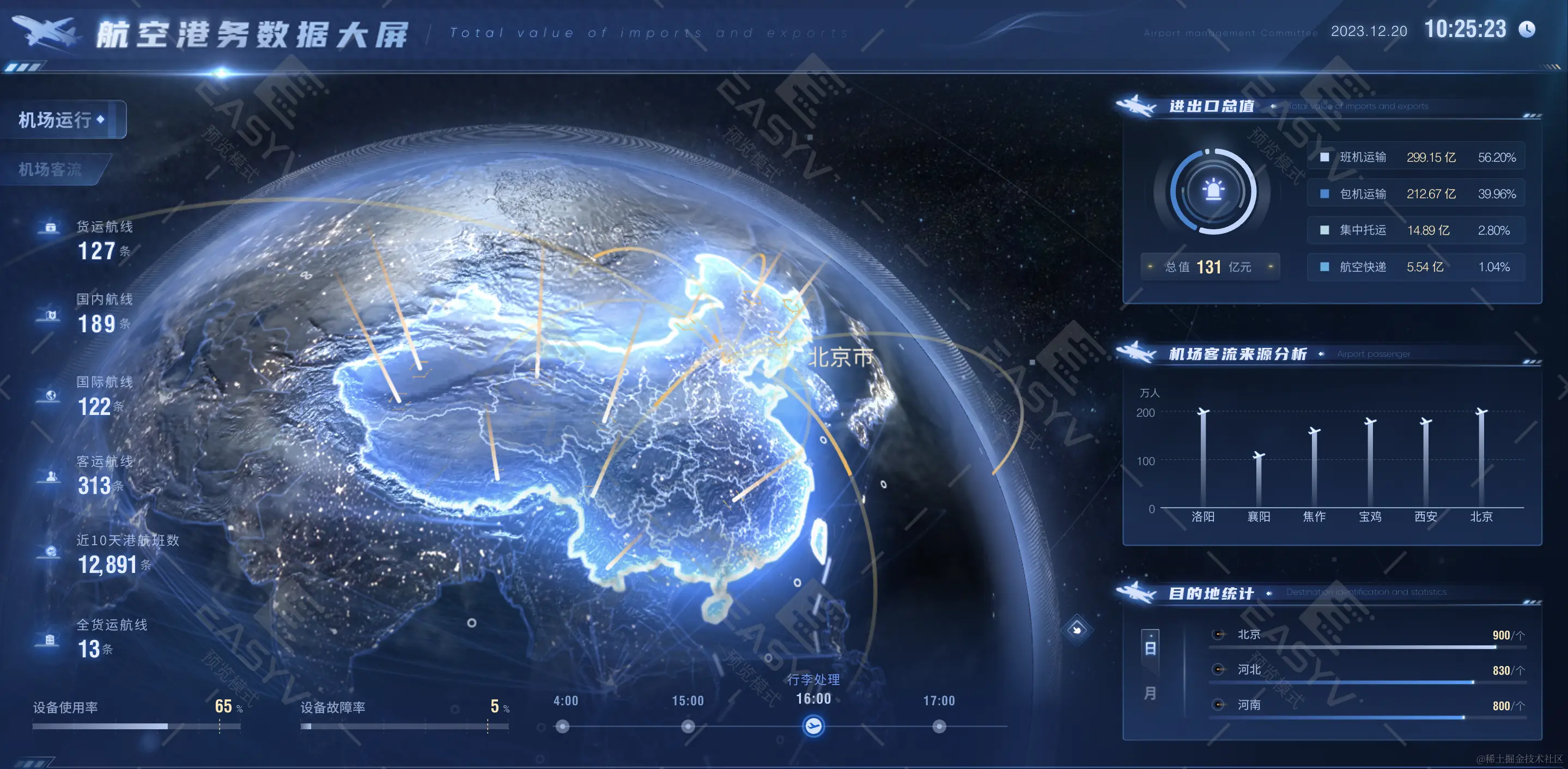 易知微航空港务数据大屏,该模板从机场运行、机场客流两个角度出发,使用3D边界地图V2,把握航空港务的整体数据。它集成了各类航空港的运行管理、货运数据、航班信息等实时数据,以直观的方式展示给工作人员和管理者,帮助他们更好地了解和掌握航空港务的全貌。同时,以其直观、全面的特点,极大地提高了航空港管理的效率和安全性,不仅可以准确地监控航空港内各个环节的运行情况,还可以及时预警和处理可能出现的问题,进一步确保了航空港的运营安全。此外,航空港务数据大屏还可以帮助航空公司和货运代理商进行航班、货运的计划和调度,提高运营效率,降低成本。通过对航空港务数据大屏的综合分析和统计,相关部门和公司可以更好地制定战略规划,提高市场竞争力。
