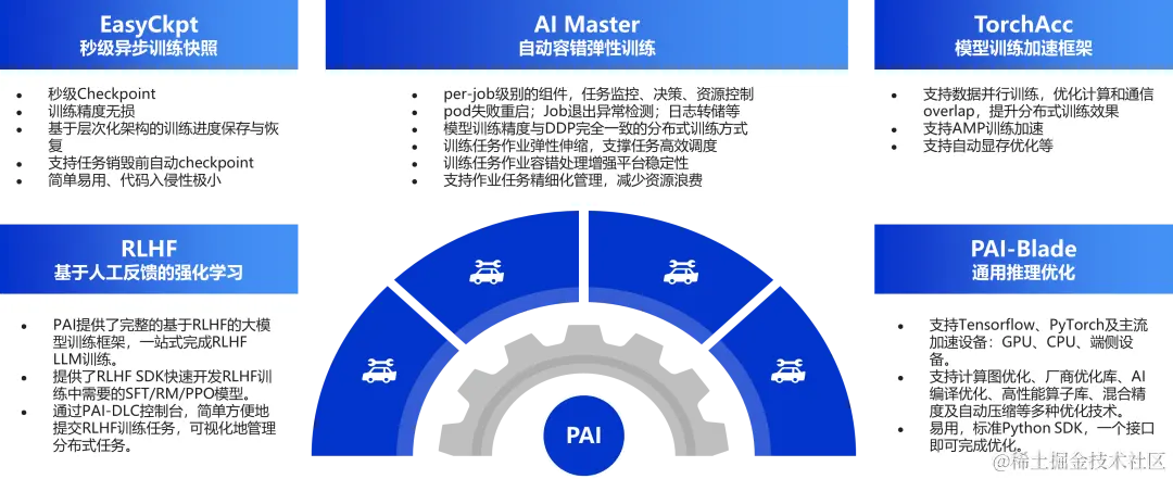 TorchAcc 和 PAI-Blade 则是在大规模分布式训练和推理上做的软硬结合优化。