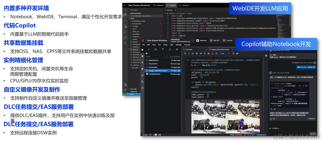同时我们也看到数据对于 AI 的重要性,PAI 把整个阿里云上的存储都做了无缝对接(OSS、NAS、CPFS),可以很容易的在云上获得做大模型开发的工作的环境。