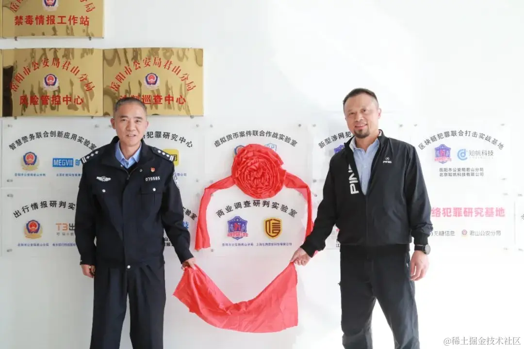 湖南岳阳市公安局君山分局党委副书记、政委吴灿(左),合合信息董事、副总经理陈青山(右)为商业调查研判实验室揭牌