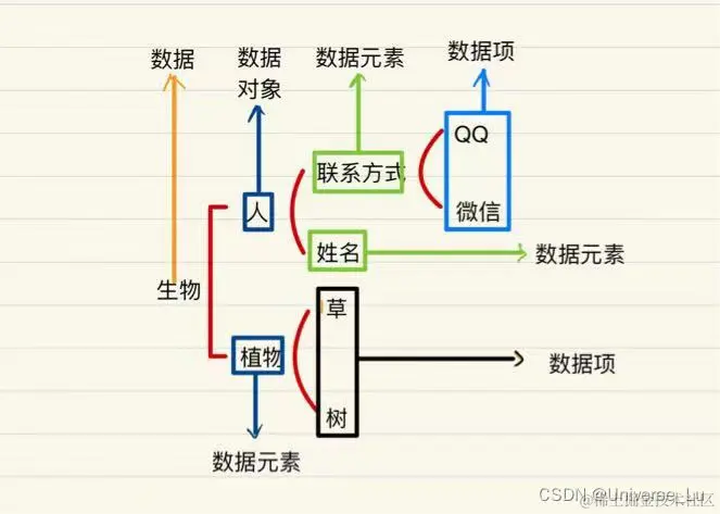 四者是由大到小的关系,也就是说数据元素是由若干数据项组成(数据项已是最小单位,不能再分了),数据元素又组成数据。其中性质相同的数据元素的集合组成数据对象然后再组成数据;如下图关系: