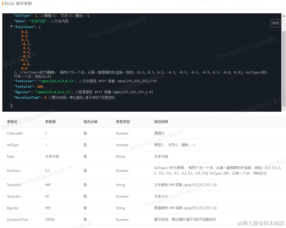 Positions:SeiType=1时为画框,每两个为- 个点,从第一象限顺时针连接,例如: [0.5, 0.5, 0.3, -0.3, -0.3, -0.3, -0.3, 0.3, -0.8, 0.8]; SeiType=2时,只传一个点, 例如[0,0]。