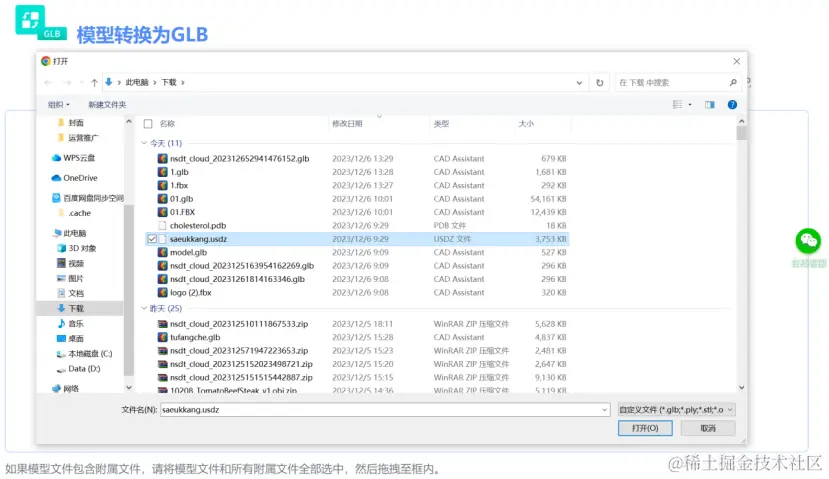 USDZ转GLB网站也支持通过拖拽的方式,将文件进行上传。在资源管理器中,选择一份或多份模型相关文件,拖拽至USDZ转GLB网站中的文件接收区域,即可完成3D模型文件的上传。