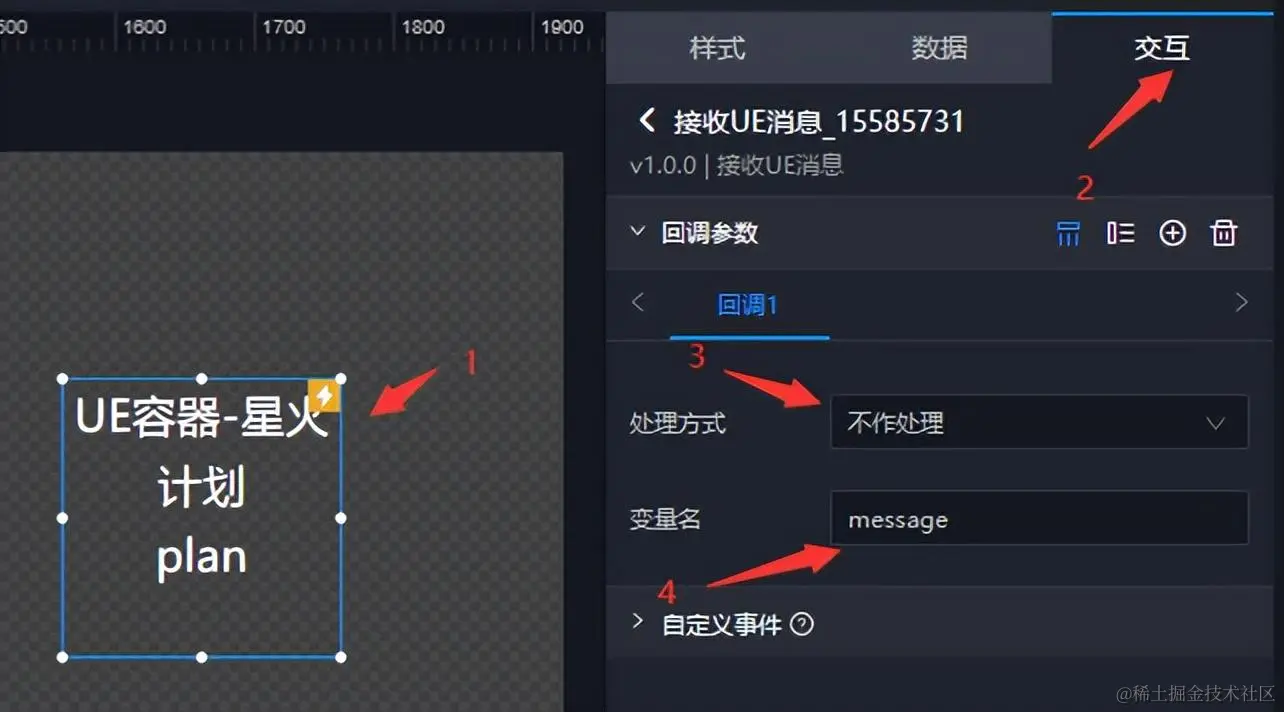 回调负责发消息,这里我们还是以标题为例,当 UE 给 EasyV 发送某个字符串,EasyV 需要显示时,就需要用到回调。选中 UE容器-星火计划,选中接受 UE 消息子组件,点击交互,设置回调。