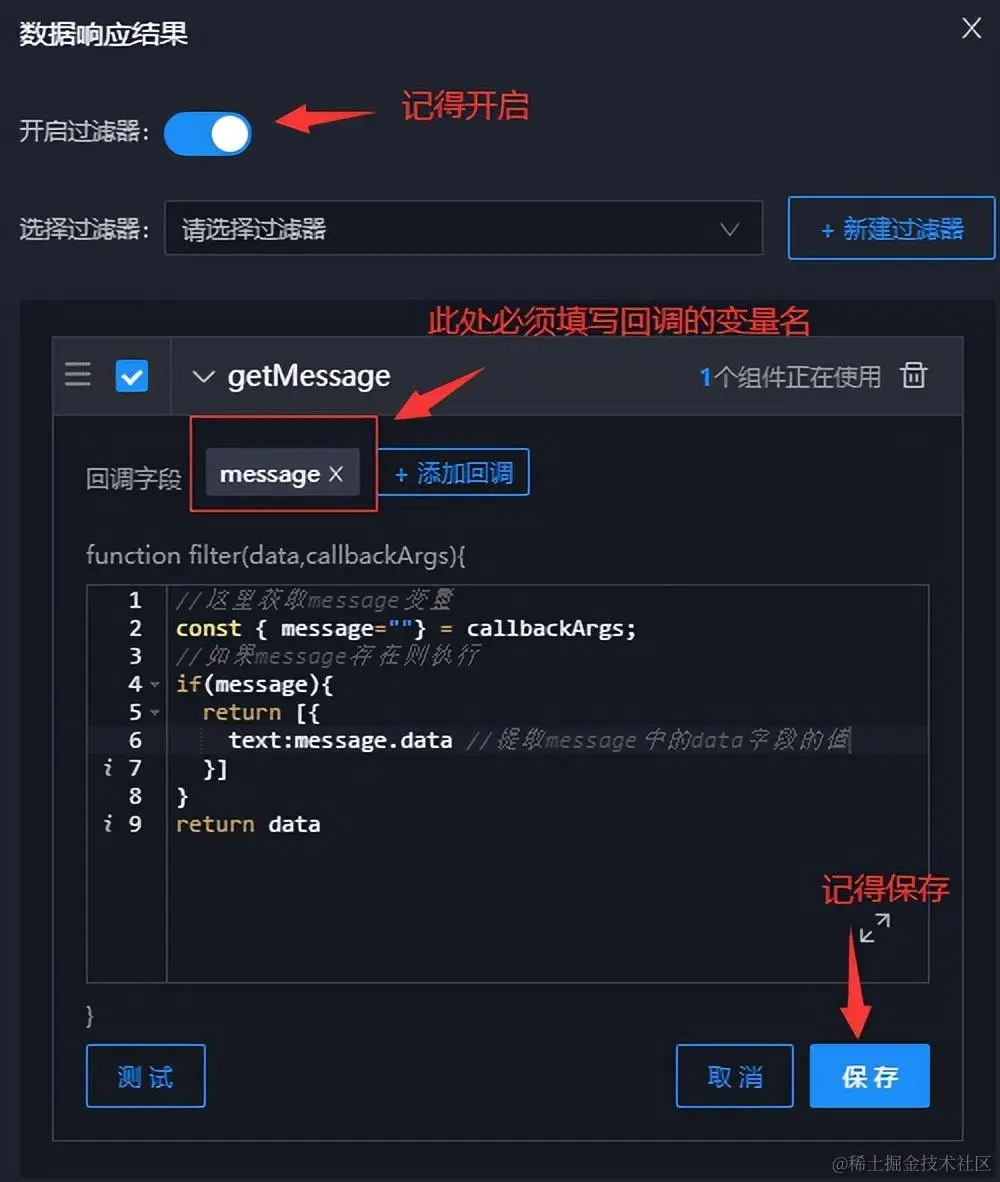 这里回调有三种处理方式,分别为 "不作处理","提取data","提取data内字段",这里以 "不作处理" 为例,我们将变量名设置为 message。