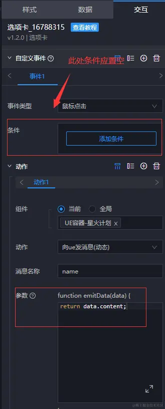 "向ue发消息(动态)" 会有一个参数配置项,如图所示,这是一个可以输入 js 代码的输入框,默认会传进一个参数 data,这个 data 就是选项卡的选中项数据 { "s": xxx, "content": xxx } ,这里 return 了 data.content ,就是把选项卡的 content 字段内容发送给 UE 的意思。当然,如果你对 js 比较熟悉,你也可以自己设置 return 的内容。这样做之后,每次点击选项卡,就会将对应选项的 content 内容发送给 UE 了。