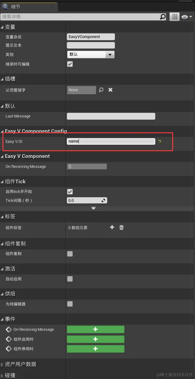 在需要接受EasyV消息的Actor中添加EasyVComponent组件
