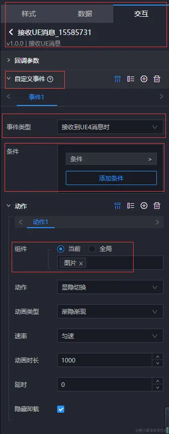 接下来,我们再给这个子组件添加自定义事件。我们先在 EasyV 中放置一个图片组件,当接受到 UE4 的消息时,让这个图片组件进行显隐切换。然后设置 UE容器 的子组件自定义事件如下: