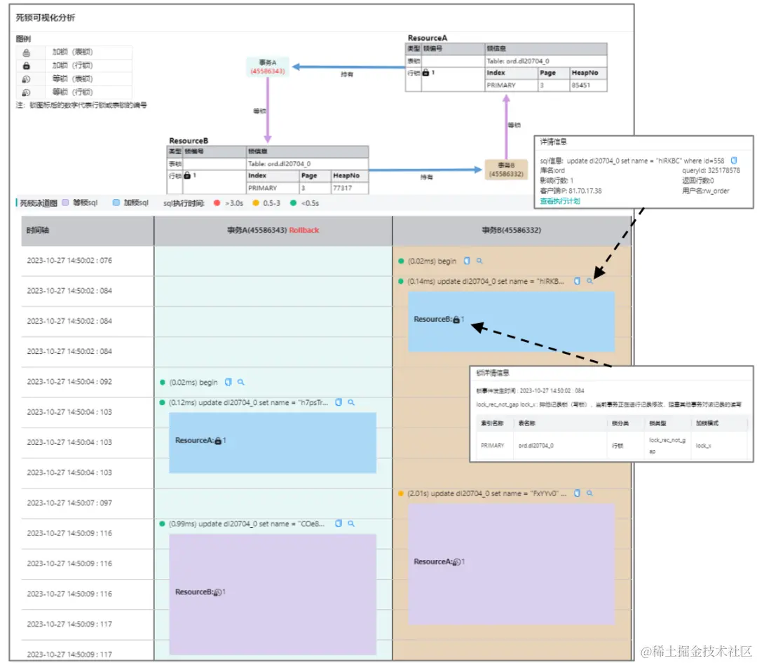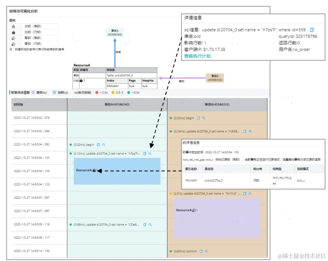 同时采集包含详细锁数据的细粒度数据,在大数据处理阶段将此串联,形成下面的锁泳道图。并将锁问题划分为锁等待、死锁、长事务、未提交四个事件,这样我们就能按照每个事件的特征产出事件画像,比如锁等待要有等,死锁要有环。锁事件->具体的锁->锁分别所在的 SQL->SQL 分别所在的事务->事务中包含的 SQL->SQL 中又包含的锁,每个锁是什么类型,影响的行数,是持有还是等待及其 page 和 heap 信息。更甚者我们目前正在突破锁的具体数据,详情敬请期待。