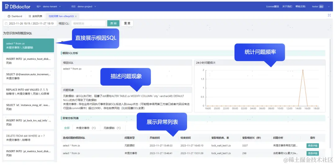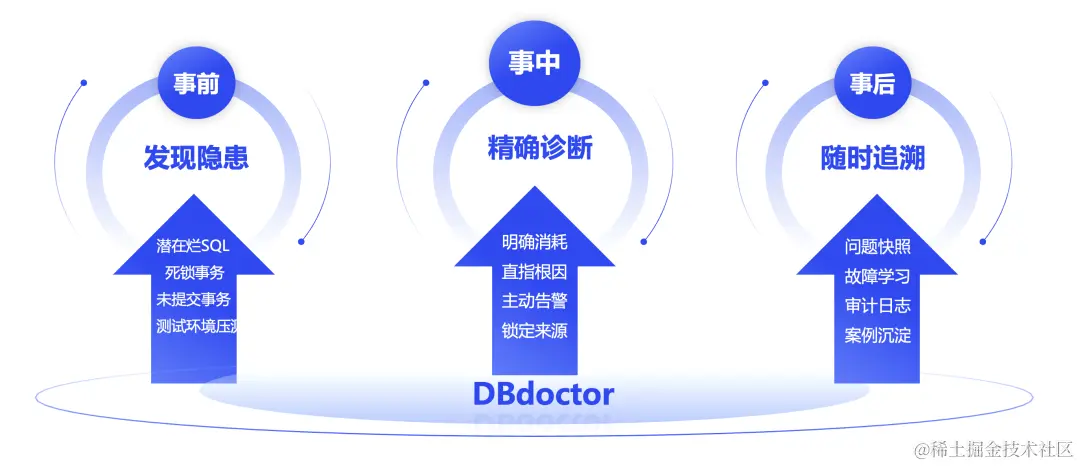 1.主动发现隐患,提前规避故障。《黄帝内经》说,圣人不治已病治未病,不治已乱治未乱,于数据库亦然。接触过一个客户,公司数据库3年内并未发生过性能故障,但是使用 DBdoctor 接入的第一个实例时就发现了一个未提交事务导致的 DDL 锁问题,过去研发也反馈过偶尔做 DDL 变更会卡住,但就是不知道是哪条 SQL 堵住的,再后来接入了大部分实例,最终找出了 35 个潜在问题,这些问题虽然现在没有发生故障,但是说不定哪天就会爆雷。另外一些新开发的系统,或者数据库引擎替换的系统,在压测过程中就可以接入 DBdoctor,把问题尽可能在测试环境暴露出来。我们目前正在突破 SQL 性能评估功能,当对 SQL 性能把握不准时可以到 DBdoctor 上实时评估,感兴趣的小伙伴可以关注我们的后续版本。