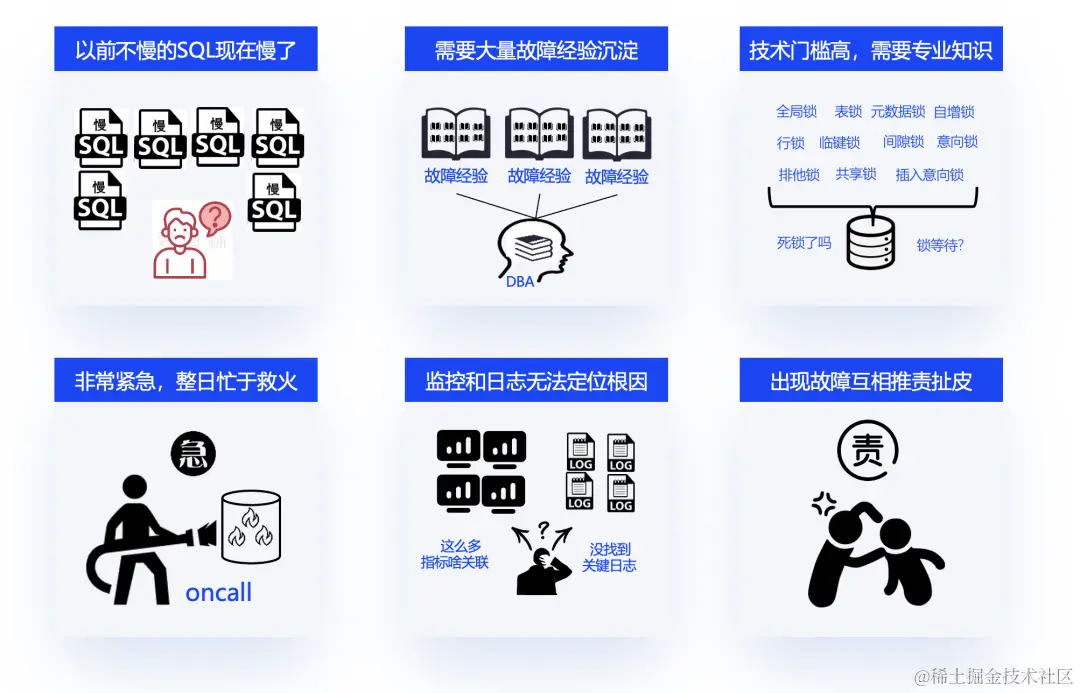 ② 事中难处理:平时没有慢 SQL,一出问题则满屏慢 SQL,有的 SQL 平时不慢突然会变慢,监控指标和日志浮于表面,难以定位根因,强依赖有大量经验的资深 DBA。