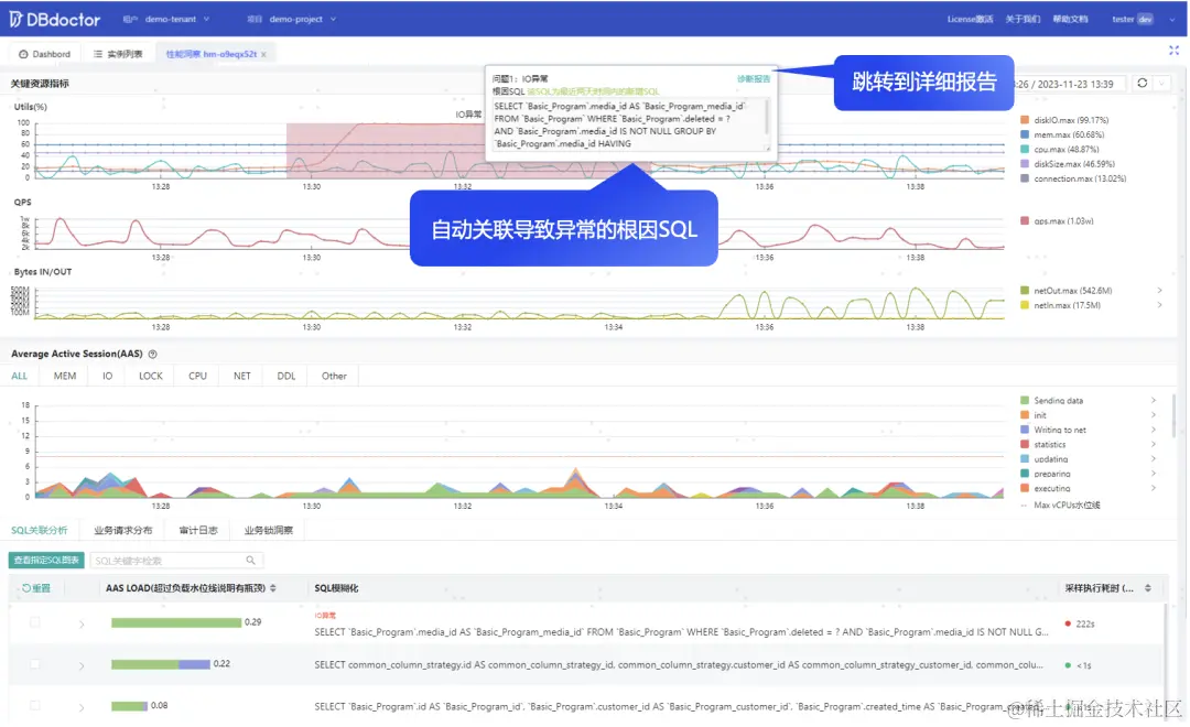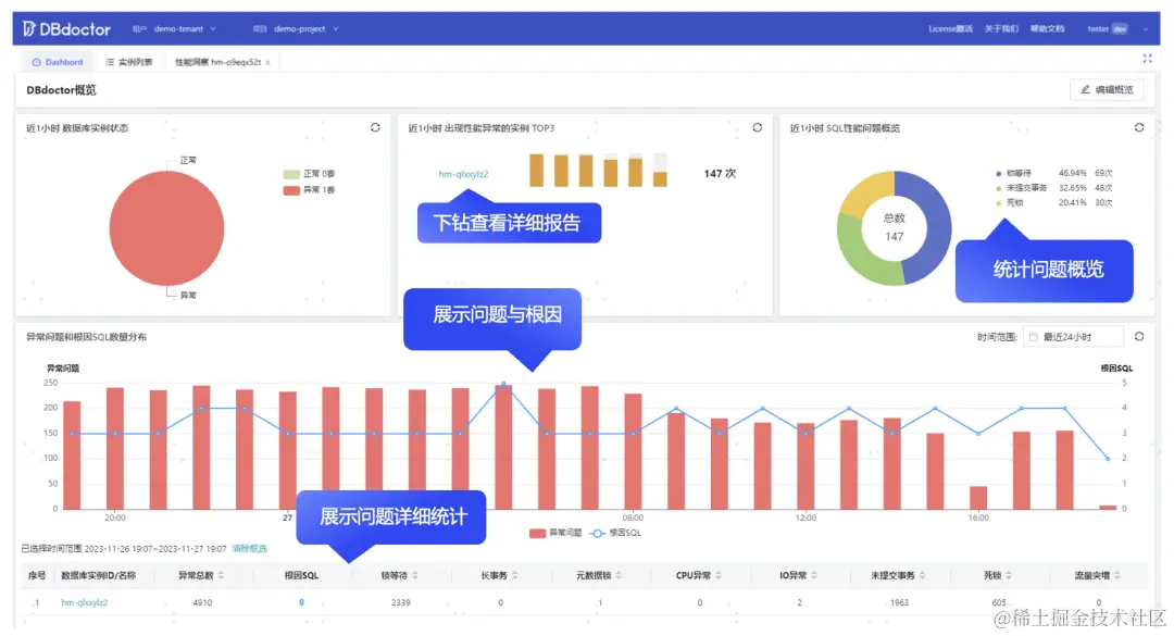 在云原生时代,DBdoctor同样支持实例的多租户管理,在租户视角提供可自行编辑的性能大盘,按照根因问题数和异常事件数两个维度查看所有实例的性能情况,可以直接点击问题实例下钻到根因诊断页面查看问题详情。