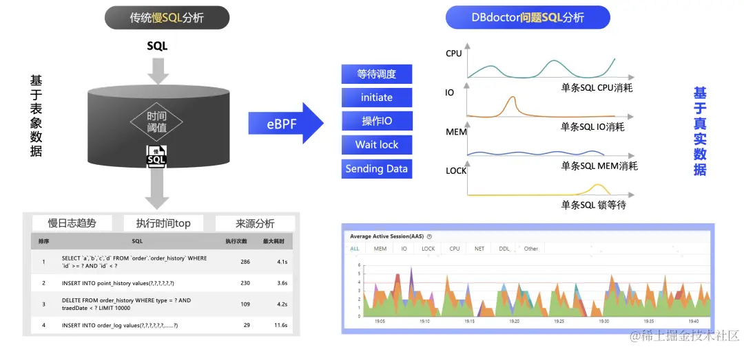DBdoctor 从 1.0 版本开始就摒弃了日志采集和经验规则方法,坚信通过数学方法解决数学问题。eBPF 是我们的主要工具,通过 eBPF 观测 SQL 在数据库内核中的执行路径,并采集各环节的重要消耗是 DBdoctor1.0 版本突破的技术点。基于这些重要数据进行大数据聚合、分析、处理并与 CPU、IO、MEM 等基础资源关联映射是 DBdoctor2.0 主要攻克的难题。通过图形相关性分析和异常图像识别的数学模型来识别根因和问题隐患是 3.0 的主要创新。下面我会逐一详细介绍这三部分优势,可能会偏技术一点,但绝对新颖。