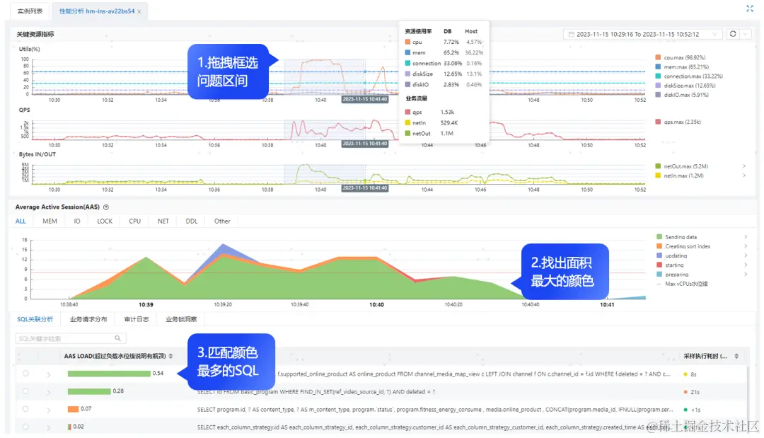 所以无需联动与推敲多而杂的指标项,只需聚焦关键资源,拖拉拽的方式便能查看到具体的诊断详情,使用颜色区分 SQL 在内核中的不同执行阶段,把资源消耗情况映射为颜色面积,由面积和相关性算法(后面会详讲)进行计算筛选从而得到主要的资源瓶颈,支持 IO、锁和 CPU 等不同资源维度切换,查看对应的资源消耗情况。