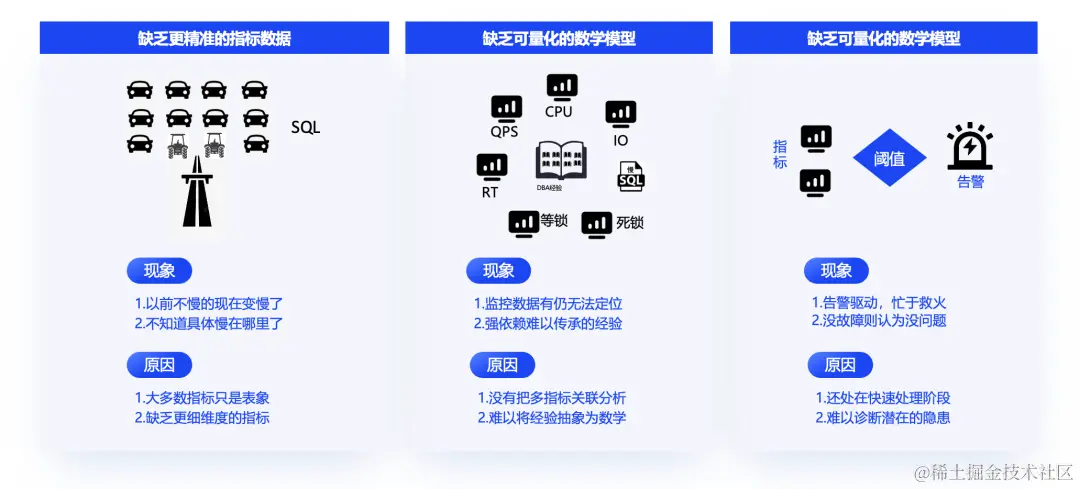 **② 缺乏可量化的数据模型。**过去靠经验沉淀,遇到问题,先看是否熟识,熟识的可以快速定位,新引入的则需要进行一系列的复现验证,能解决的就进入经验库,不能解决的就成为疑难杂症,想措施去规避。但经验积累的速度往往跟不上业务发展,于是成熟业务的经验难复用到新业务,MySQL 上生效的经验也不一定在 PostgreSQL 上生效。经验归根结底是规则,业界普遍在想方设法来丰富规则库,但多引擎并存的时代,构建通用规则库真的太难了。