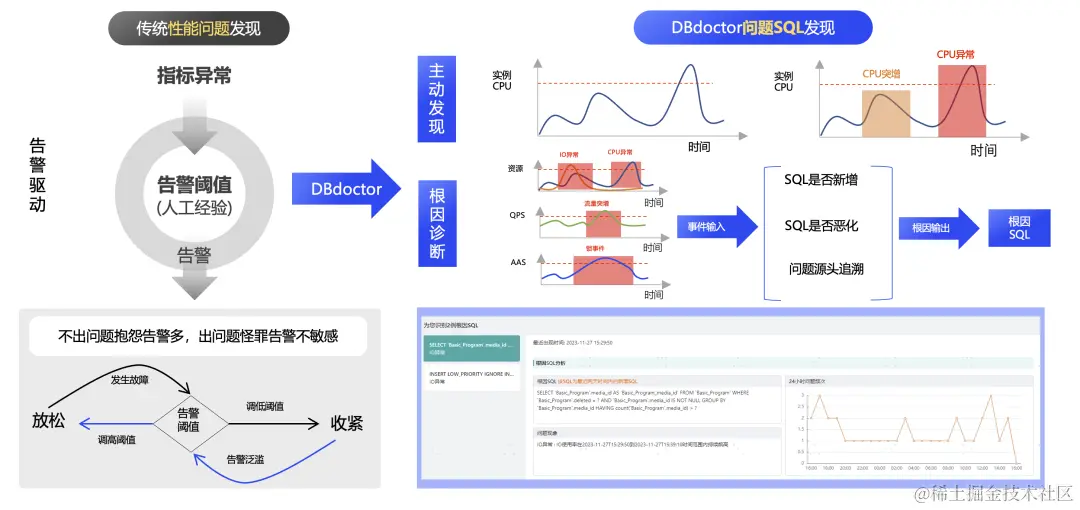 **③ 缺乏提前发现问题的措施。**传统性能问题的发现基于告警驱动,缺少主动发现的措施,通过设置指标阈值,当监控指标超出阈值后发出告警。一旦数据库实例达到一定规模后容易出现放松与收紧的两个极端循环中,不出问题时进行告警治理,调高阈值减少告警量,出现问题后会立马调低阈值提升灵敏度,治标不治本。