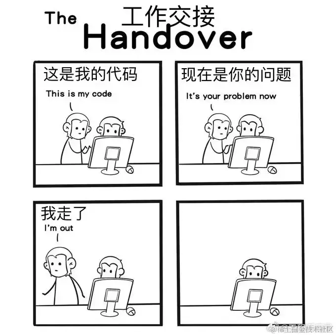 这里人员流动并不是仅仅指离职,而是包含了转岗、业务交接在内的所有系统负责人的变更。我们梳理历史项目时发现,很多债务都是在业务交接时产生的,这些债务可能是无意留下的,也可能是觉得后面我不负责了,怎么“敏捷”怎么来。对于即将不负责该系统的人来说,确实想尽快结束手上工作,然后放飞自我一段时间好去投入下一份工作,从人性出发我们可以理解,但是作为系统负责人的你却应该把控质量,及时地消除债务,因为这里留下的坑将来埋的可是你自己。