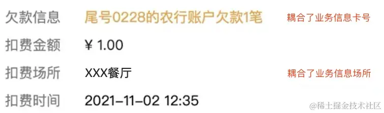 熵增更具体的表现是耦合度越来越高。曾经看过一篇文章介绍垫资系统,针对餐厅场景,当用户余额不足时服务提供方会先垫付该笔订单以保障用户可正常就餐,然后给用户发送消息通知及时还款。“发送消息”这个逻辑看起来是如此简单,包含支付时间、金额、商品名称等,这些信息都是订单信息和具体业务场景没有任何关系。随着业务发展有了指定卡扣款(用户消费只能从该银行卡扣款),随之催缴消息也要做相应的改动,于是每日定时催缴消息(分为全部指定卡订单、全部非指定卡订单、既包含指定卡又包含非指定卡订单三种消息)、非指定卡垫资成功消息、指定卡垫资成功消息各不相同,发送模版消息所耦合的业务信息越来越多,可是最初作者是想设计一个可多业务复用、和具体业务无关的垫资系统。