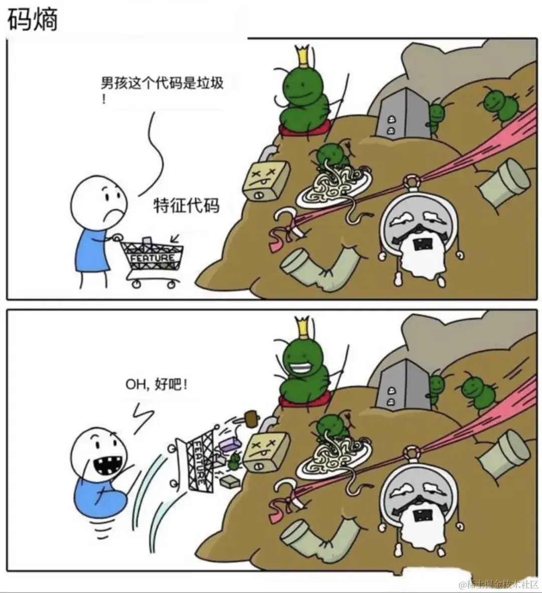 经历了一段时间的迭代,前期的各种债务、系统设计的局限性慢慢地都暴漏出来了,并且随着系统各项功能的完善,需求的交付价值越来越低,我们可能花费了大量的时间做完一个需求仅仅是解决少部分用户的轻微体验问题。这时候本来研发就难以获得工作的乐趣,面对债务更是厌恶至极,很难提起兴趣去消除腐化,这时候大概率是两种选择:1)忍受债务并在腐化严重的代码上迭代;2)自己新写一块逻辑。