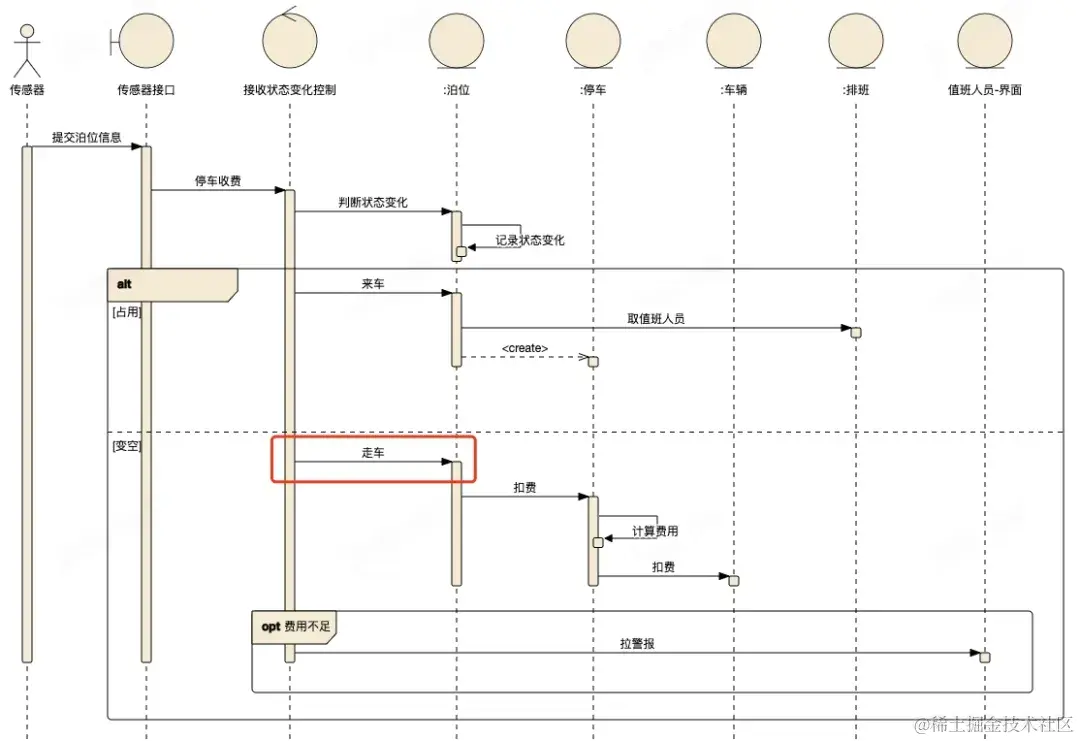 1)长函数、大类问题:其本质问题可能是实体类的责任分配不合理,举个例子:我们要实现下图中的“走车”函数,如果不根据类的职责划分,一股脑的将停车、车辆实体的扣款逻辑全部在泊位类的走车函数内实现,必然导致长函数,长函数多了也就导致类变成了上帝类。