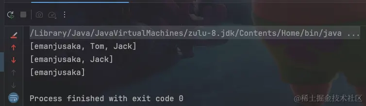 - remove(Object o):从此列表中删除第一次出现的指定元素(如果存在)。