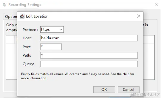 Host和Port都为*,正则表达式为匹配所有,再点击”OK”按钮