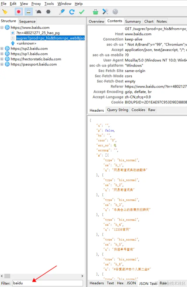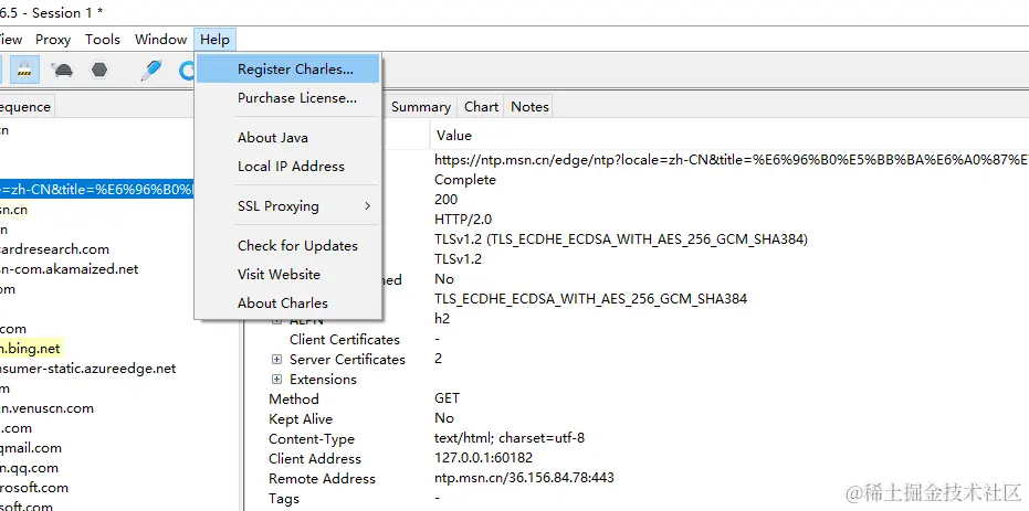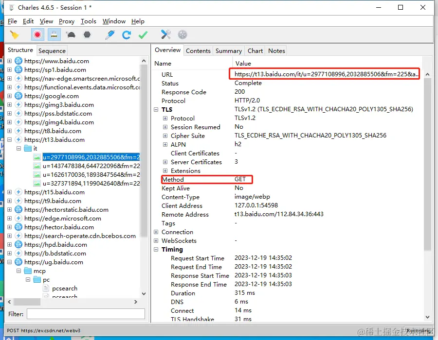 配置完成代理信息后,重启Charles,尝试获取web端的接口。浏览器随便打开一个网页,可以Charles已经在帮我们抓取网页的接口了。